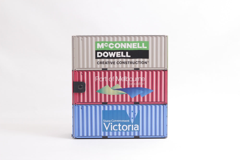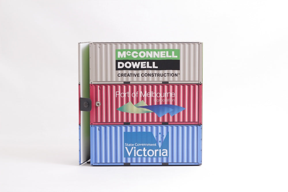 box made to look like 2 shipping containers. When opened up, It contained a pitch to buy the Port of Melbourne. Digitally printed using file supplied by client