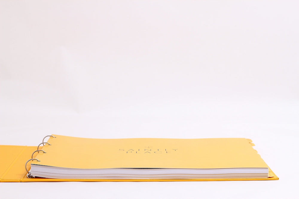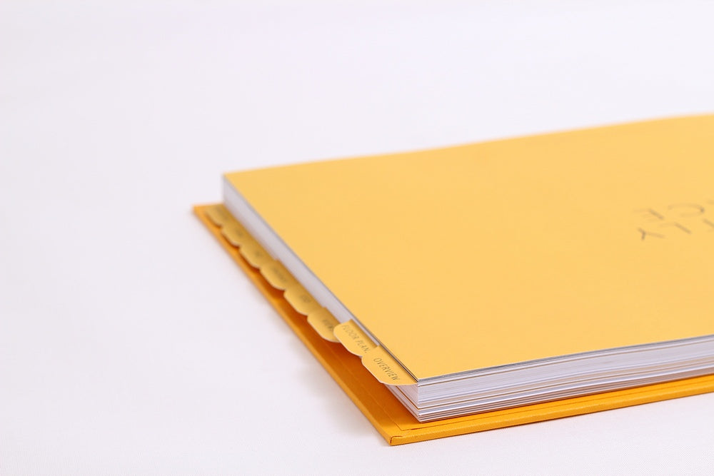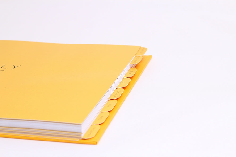 This entire job was done in house, including tabs and text pages. Bound in yellow Arbelave buckram with all logos printed in black. Text pages were printed on Sovereign Offset. Tabs on 350gsm card and matte laminated for durability, then tabbed in house . Binder scored for professional finish. A3 landscape A3 Portrait