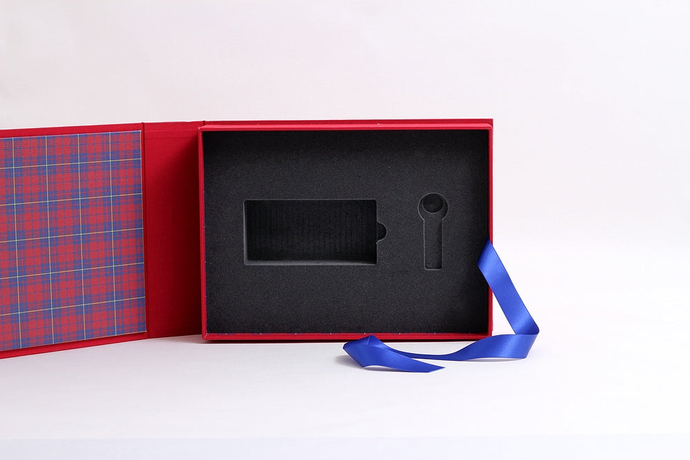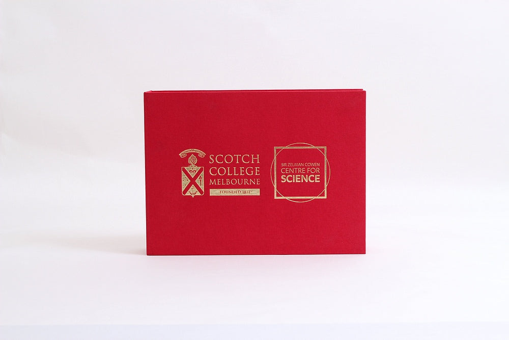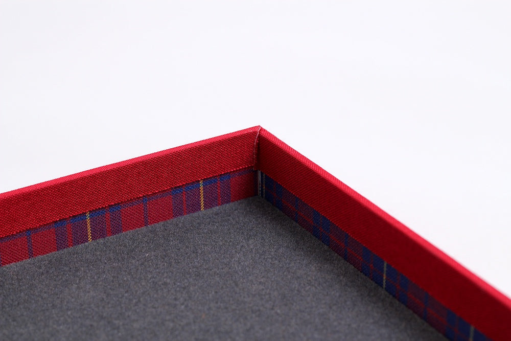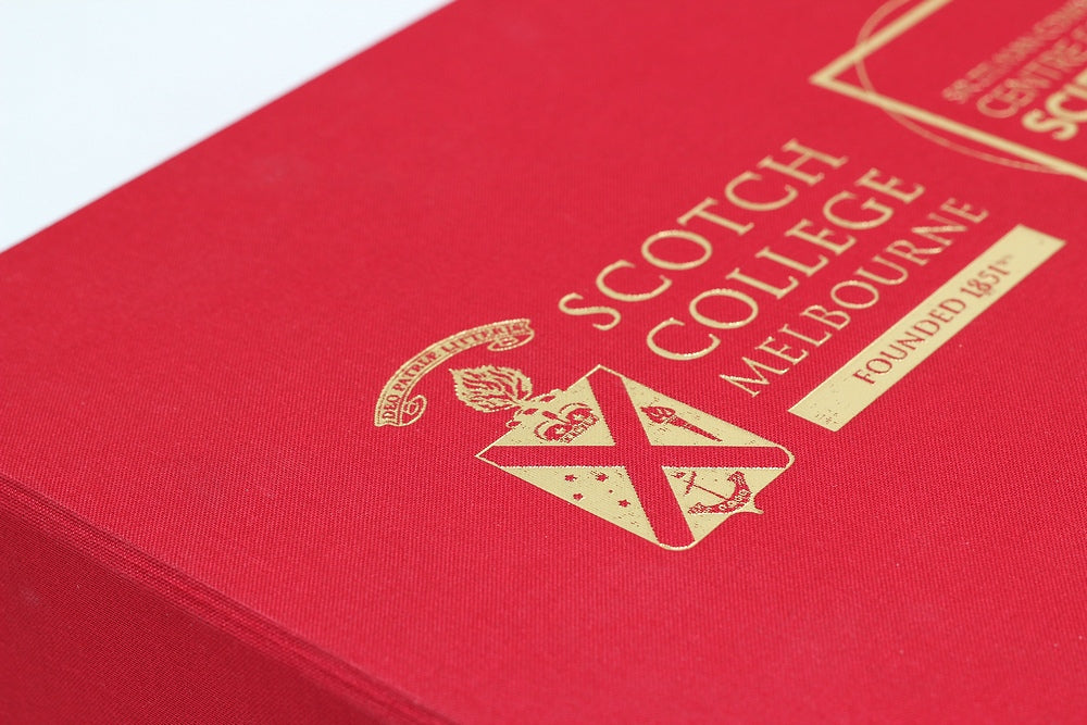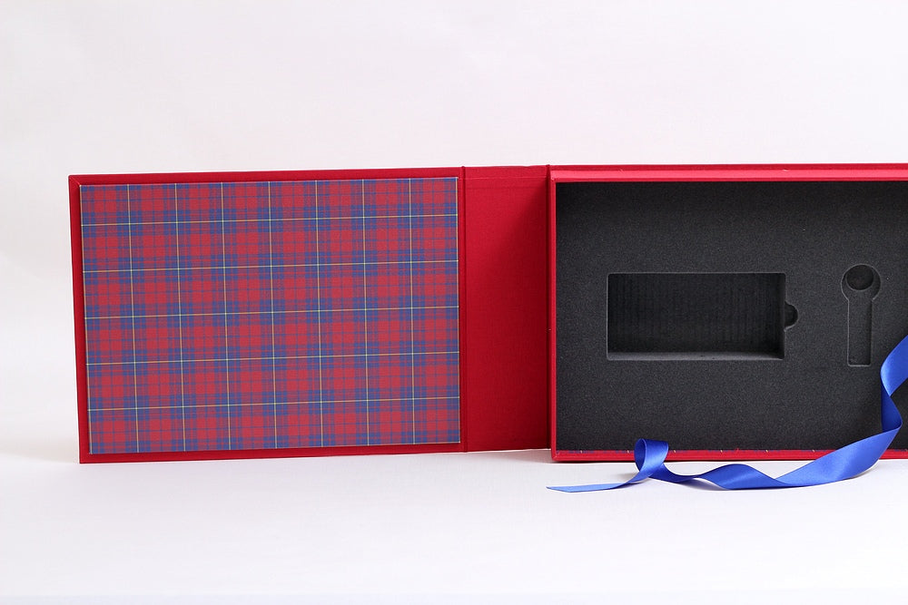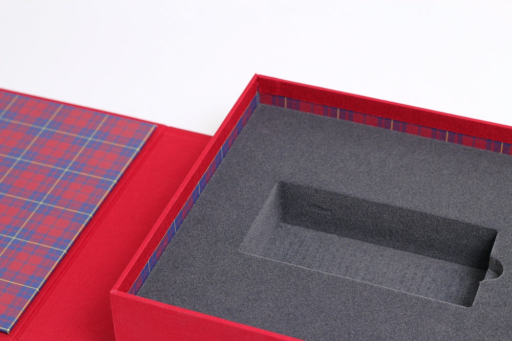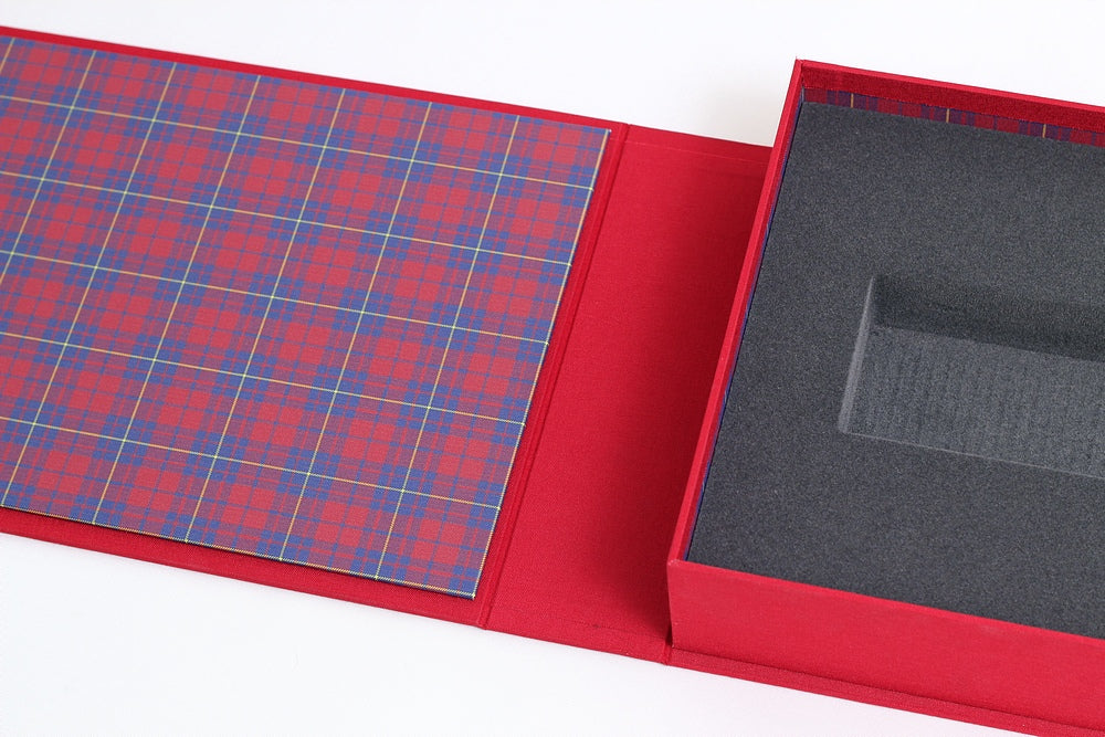 Initially these boxes were made overseas but the client was unhappy with the quality and asked us to replace them. The inside cloth we printed to their supplied tartan design. The red cotton cloth we had flown in specifically for their requirements. Foam insert was CNC routed and flocked. Foil stamped in fine detail. A quality box speaks heaps about a client as does a shoddy one.