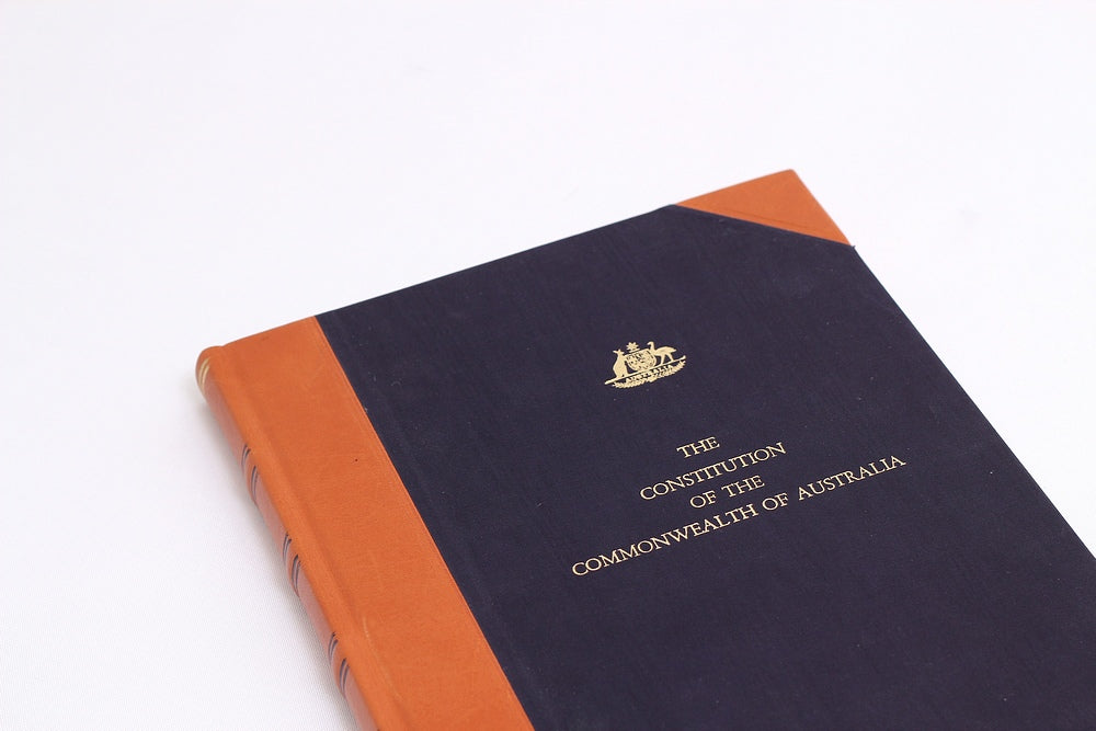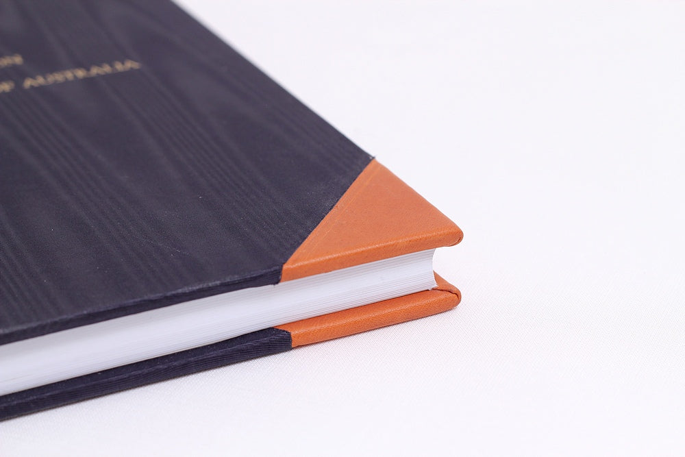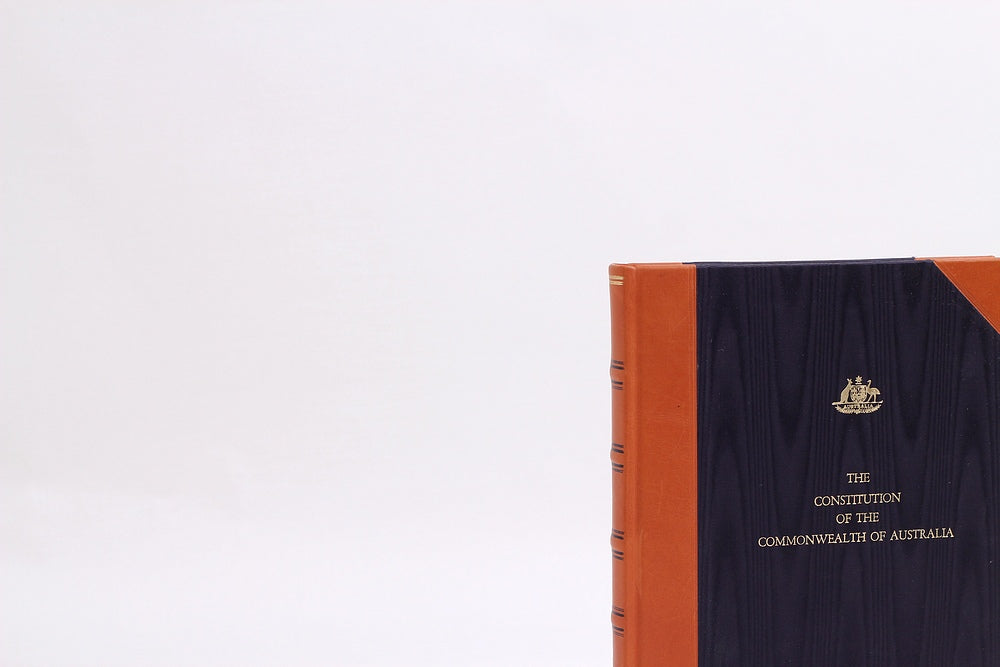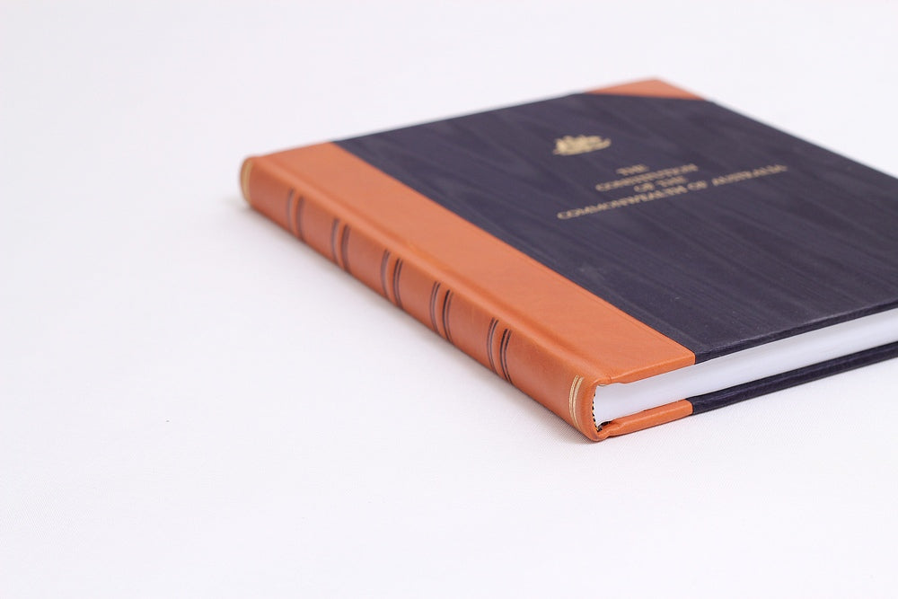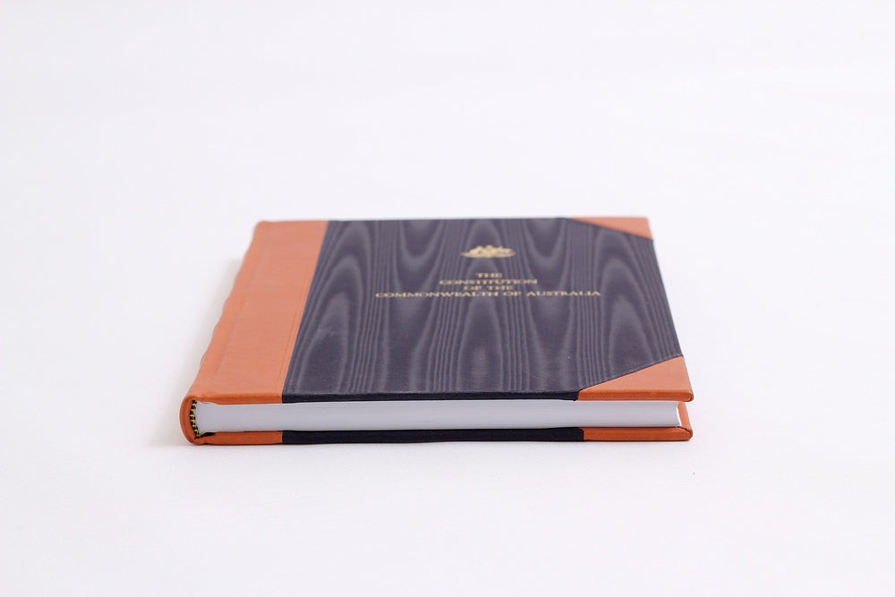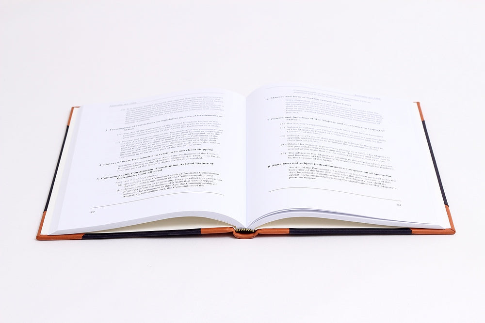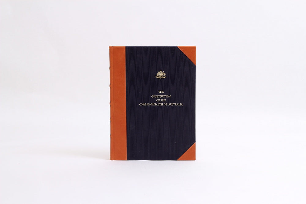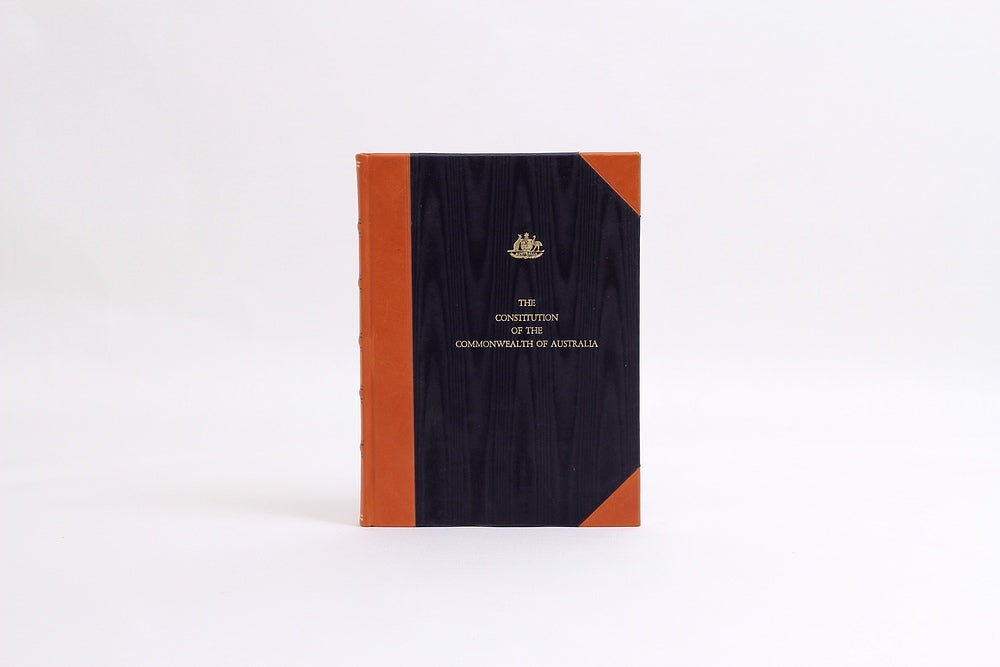 Government presentation copies of the Australian Constitution. Hand tooled bark tanned leather with traditional raised bands. Moire water grain cloth inserts. Crested and titled on the front. Designed to open flat, for annotation. B5 250X170 portrait.