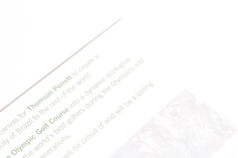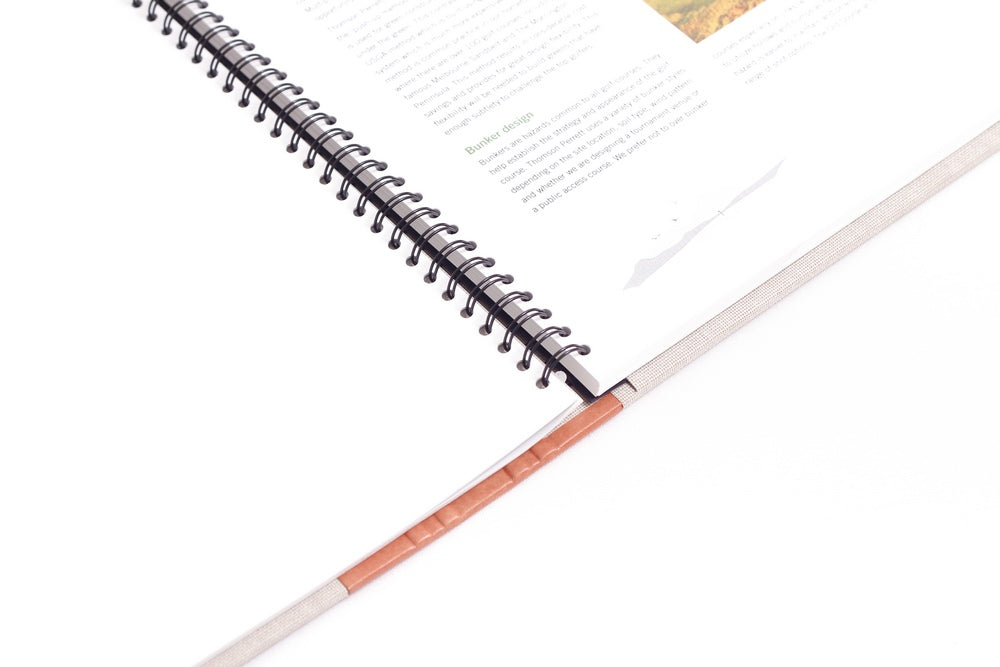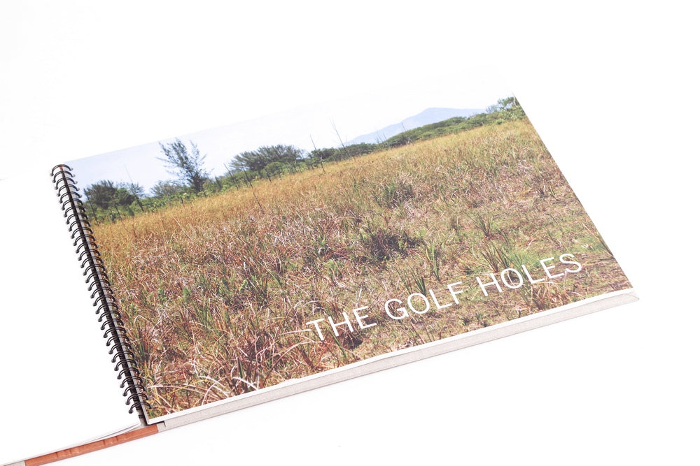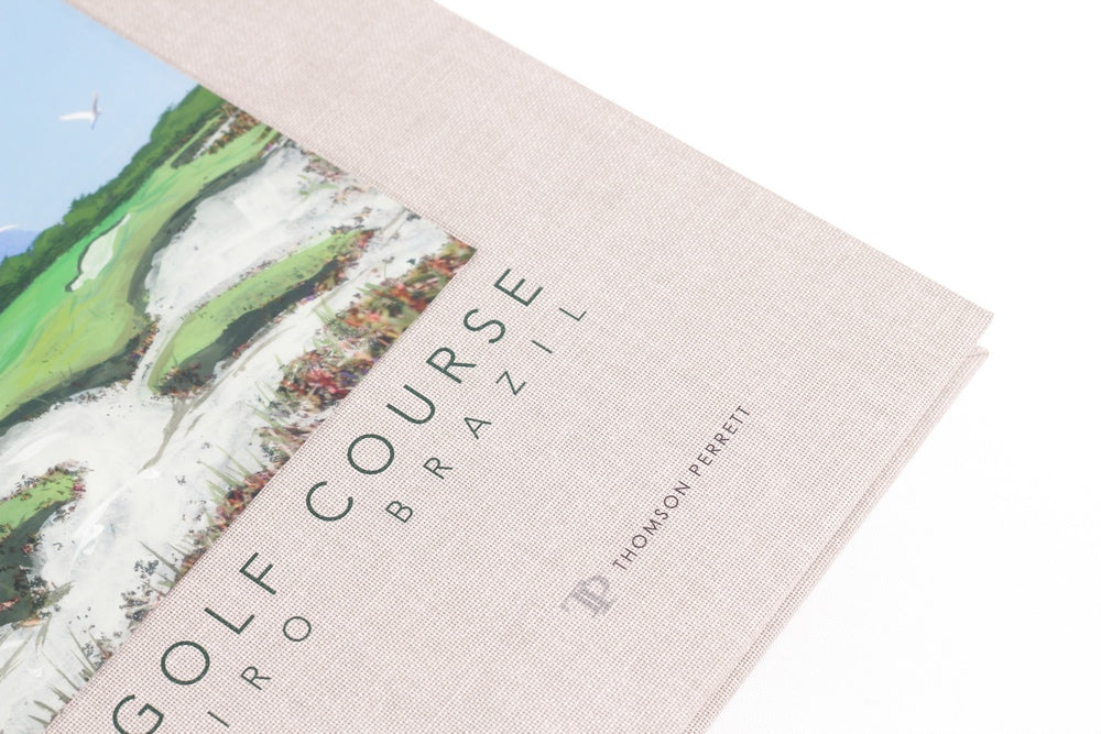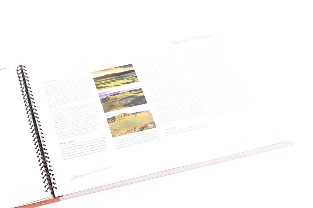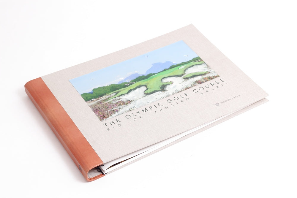 A slip case and binder with leather spine and an inlaid image portraying the design of a proposed international golf course