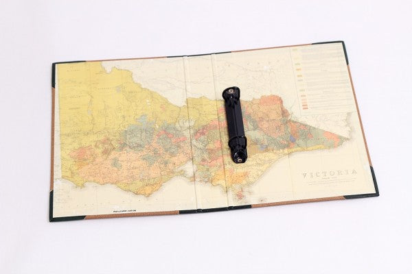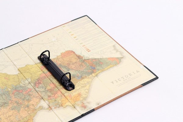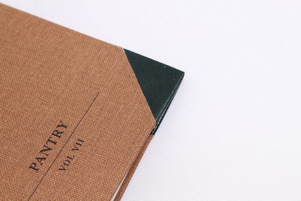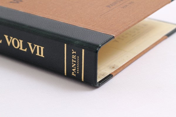 Half bound in Tara tanned green goat leather sourced from Packer Tanning in Queensland, these A5 ringbinders have a printed lining and gold foiling to contrast the raw brown Buckram from Italy and internal luminaire from Holliston Mills in the USA. Black logos were printed on to the cloth not stamped.